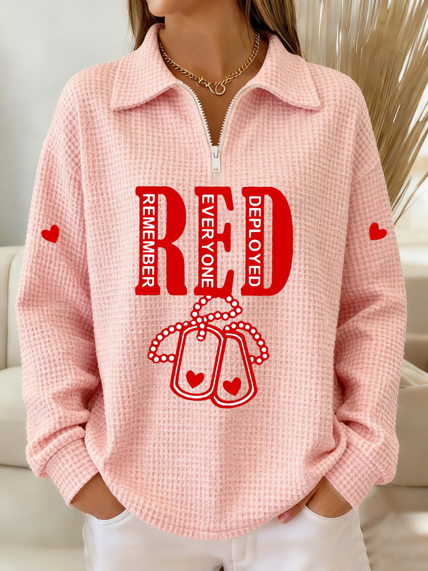Women's Winter Friday Let's Wear Red Veteran Print Waffle Lapel Top